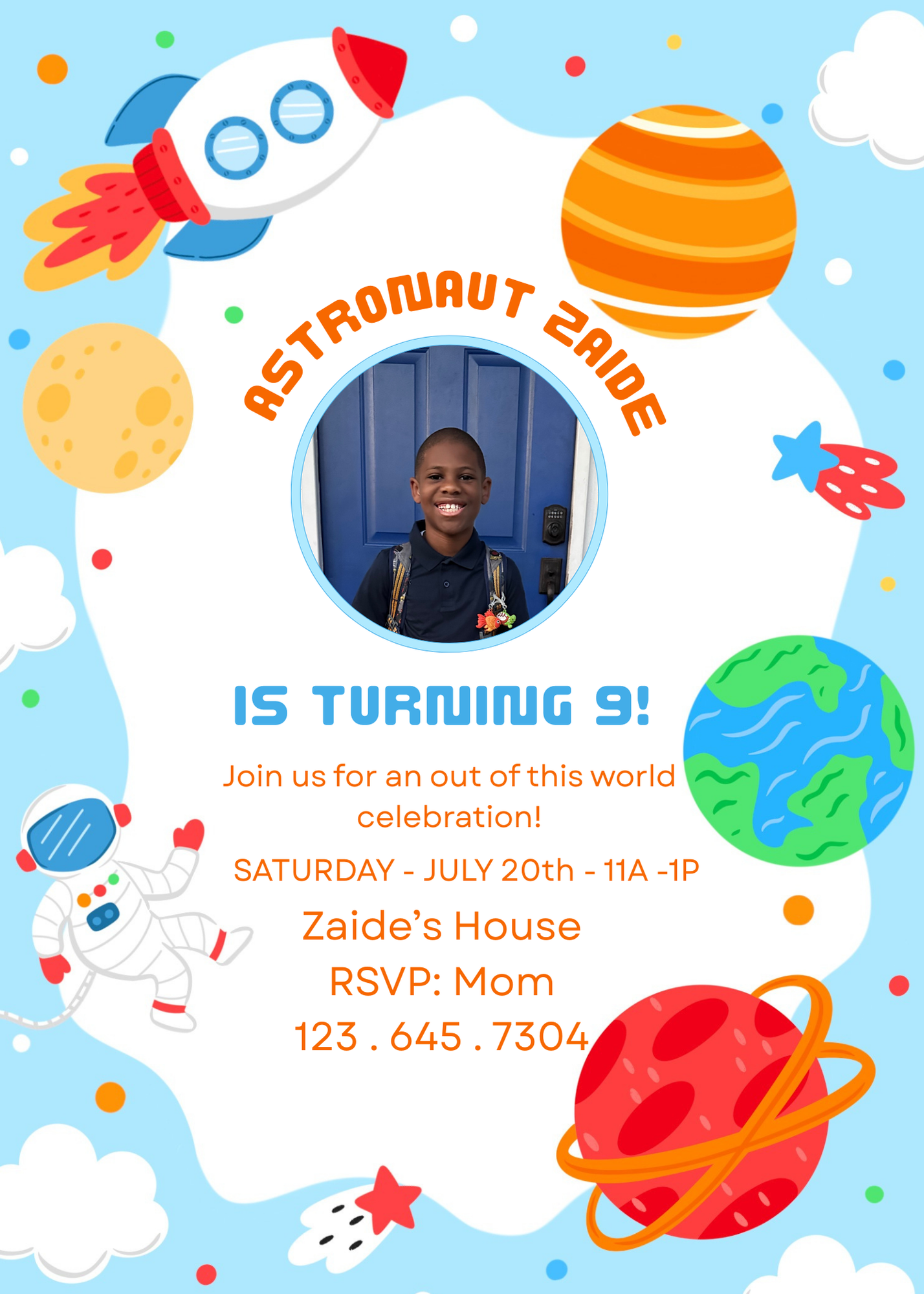 Take your party out of this world with our Beyond the Stars Birthday Invitation! This modern, space-themed invitation is fully editable in free Canva and lets you add your child’s photo for a personalized touch. Perfect for space birthdays, astronaut parties, or any galaxy celebration.