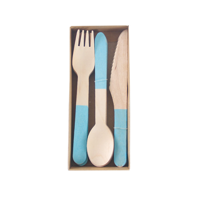 • Blue Wooden Utensils – 24 total (8 forks, 8 knives, 8 spoons)